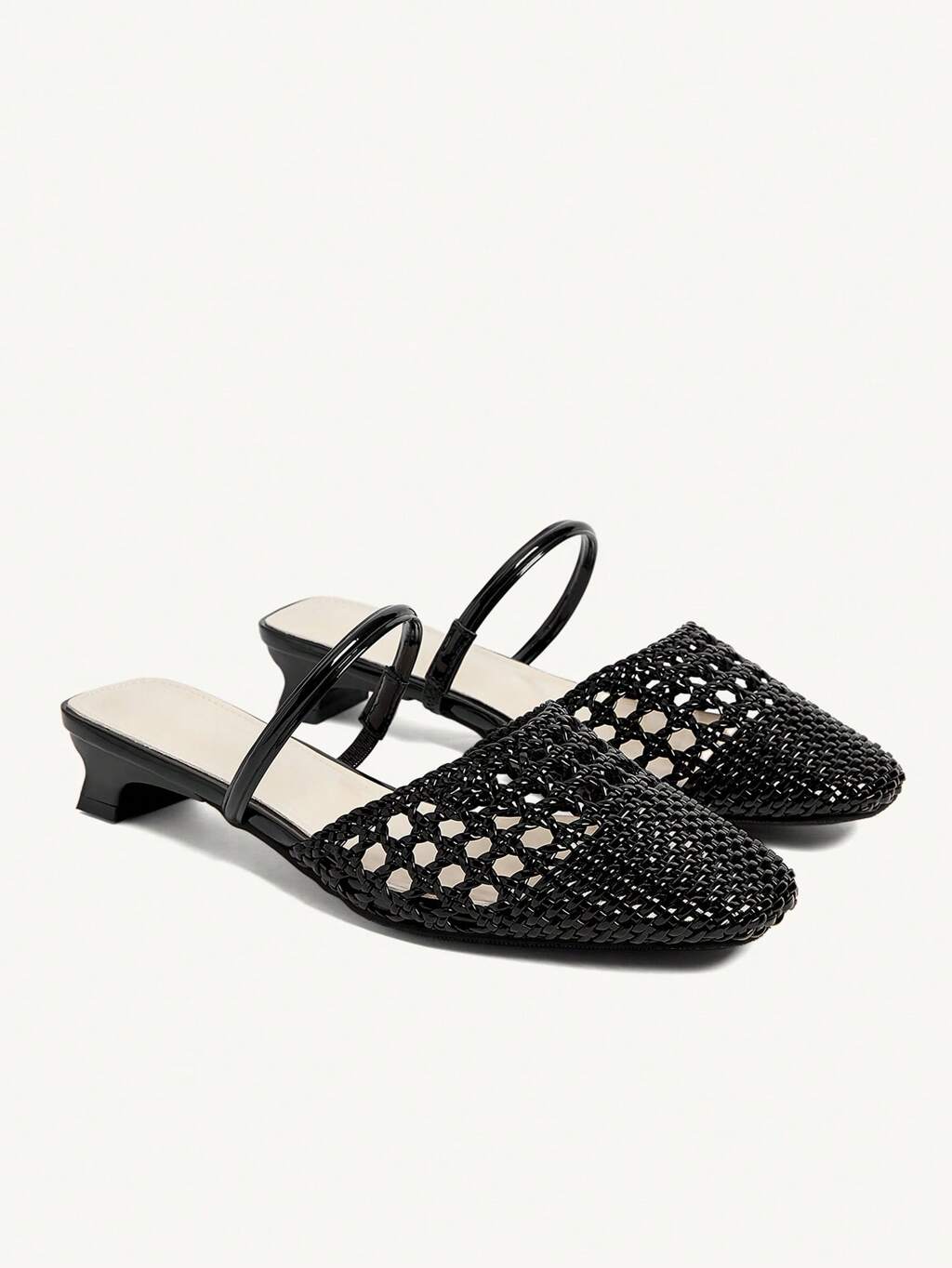CUCCOO CHICEST Women's Woven Hollow Square Toe Chunky Heel Low Heel Elegant Vacation Casual Comfortable Minimalist Black Woven PU Leather Ladies' High Heel Slide Mule Sandals, Spring/Summer New Vacation Style, Afternoon Tea Chic Beach Outfit
