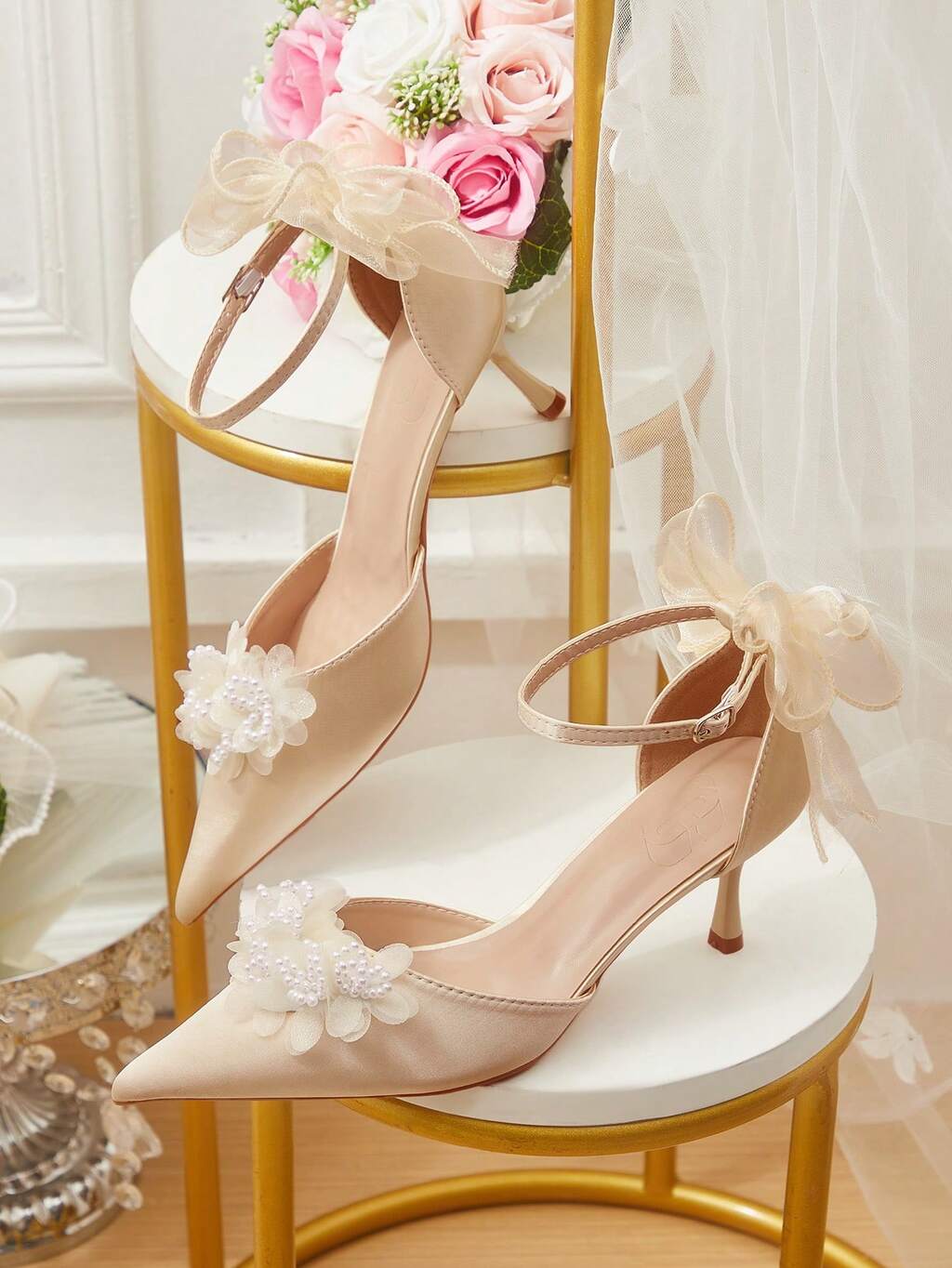 CUCCOO HITCHD Women Shoes Spring And Summer New Fairy Mesh Bow Pearl Flower Decoration Pointed Thin Heel Buckle 6cm Women's High Heel Shoes Gentle Elegance Satin Solid Color Banquet Dating Bridesmaid Shoes