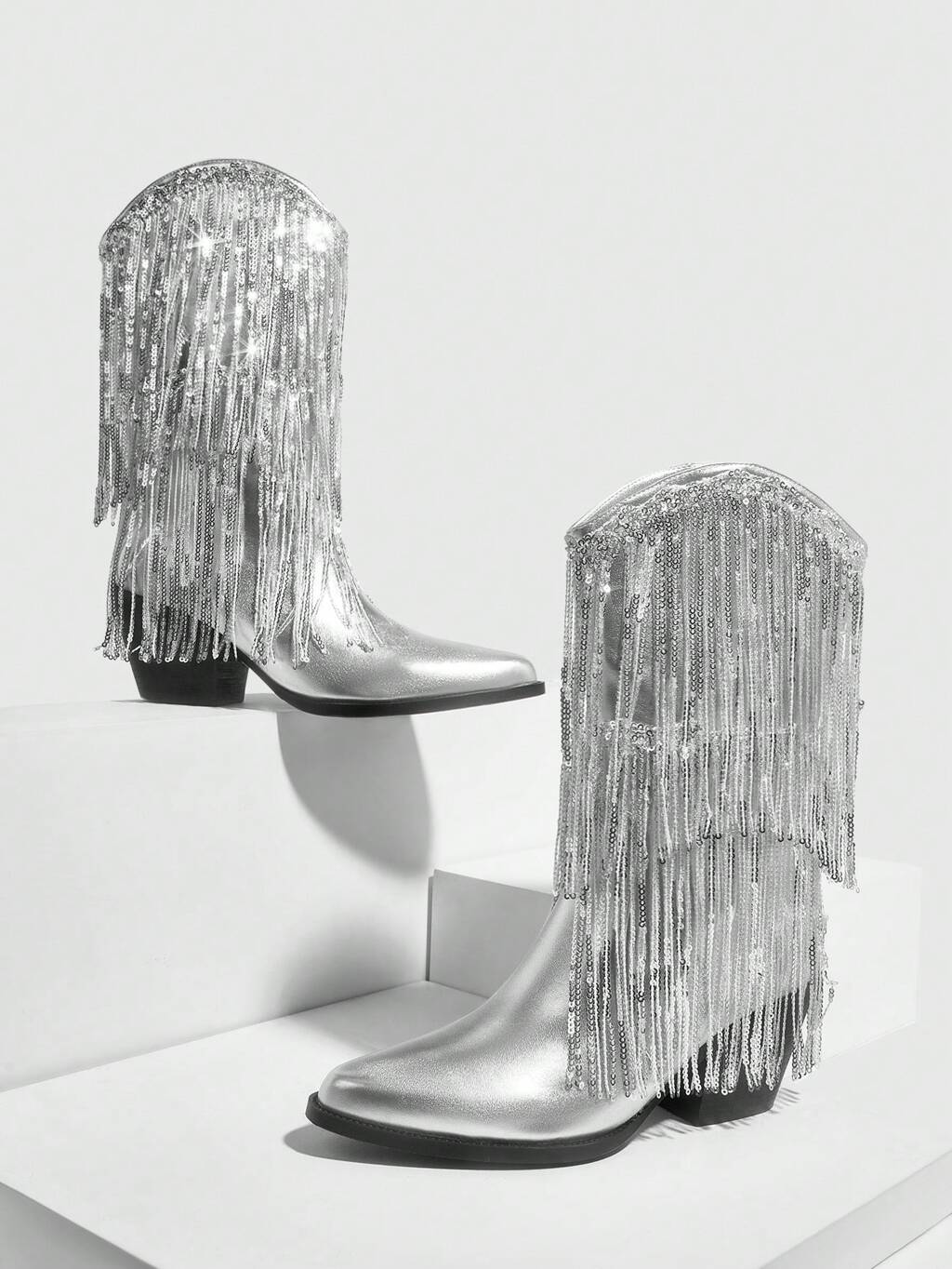 CUCCOO SZL Women Shoes Fringe & Sequins Decor Point Toe Chunky Heeled Western Boots, Glamorous Outdoor Boots Valentine's Day For Summer Graduation Heels Prom Heels Vacation Shoes Summer