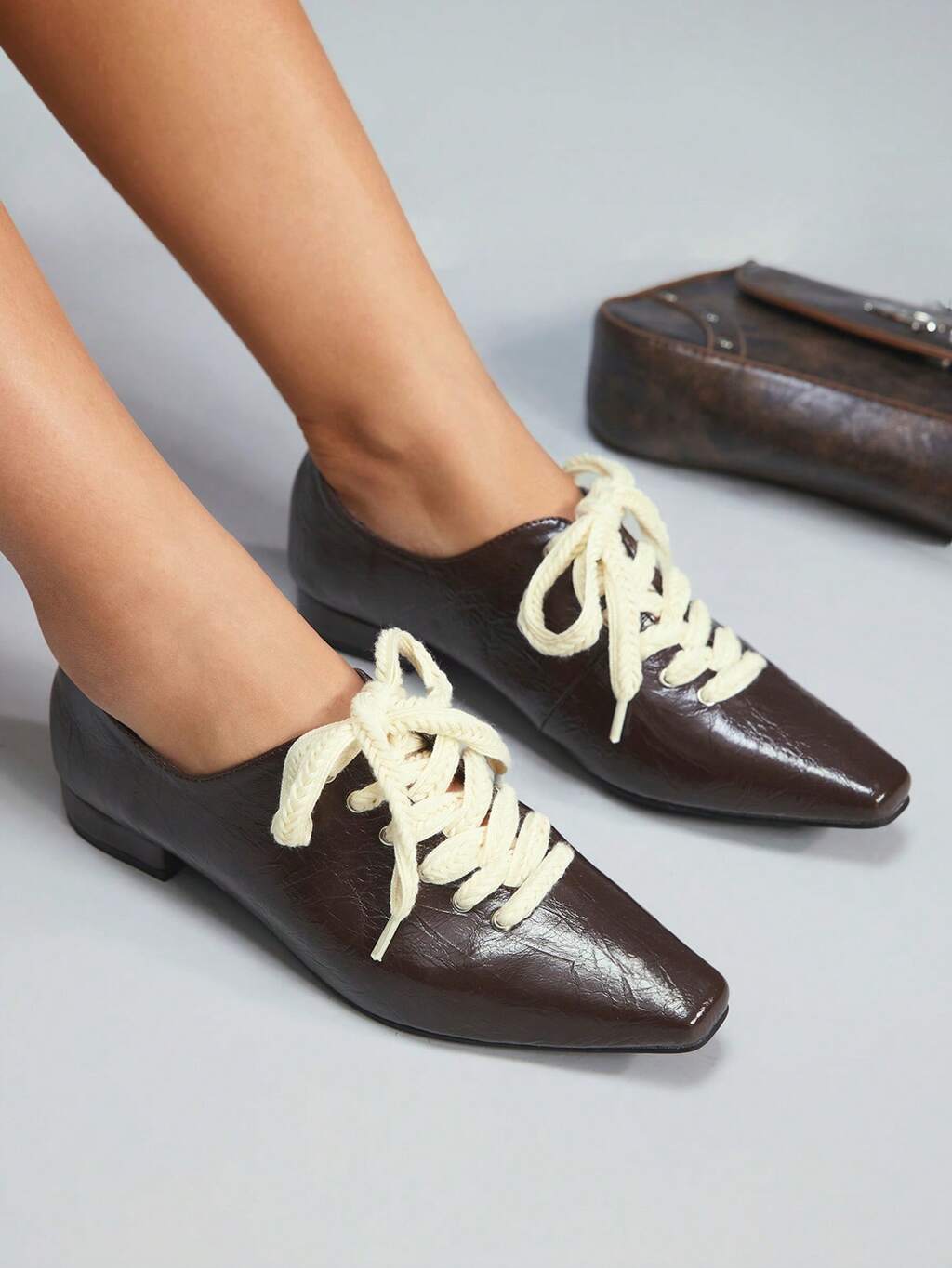 CUCCOO DOLLMOD Women Square Toe Flat Black PU Leather Minimalist Casual Comfortable Lace-Up Dress Shoes Suitable For Daily And Party Occasions