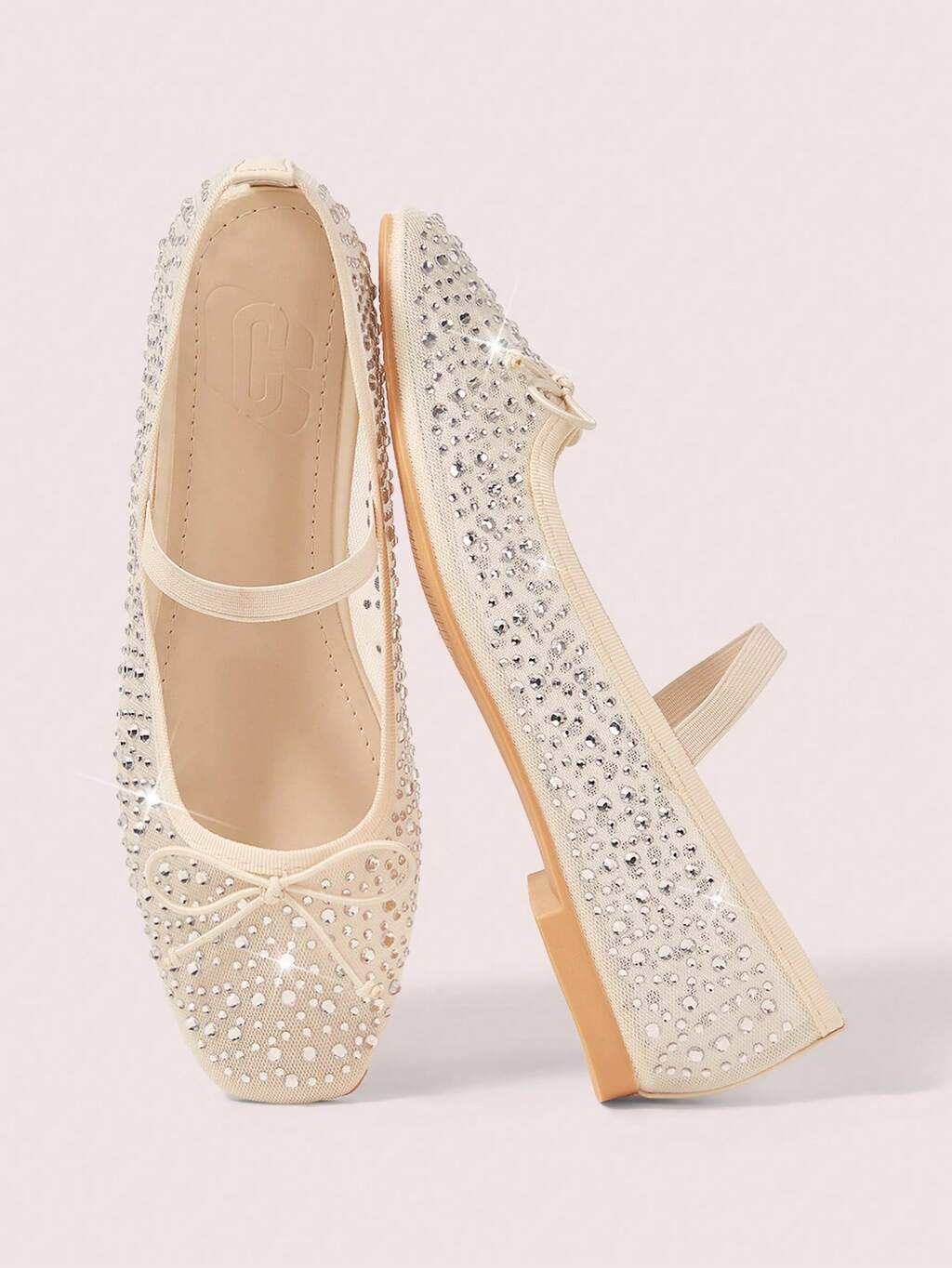 CUCCOO DOLLMOD Women Shoes Spring And Summer Fashion Beige Full Diamond Mesh Yarn Small Bow Elastic Band Women's Flat Shoes Elegant Comfortable Breathable Cute Sweet Mary Jane Flat Women's Shoes Spring Shoes