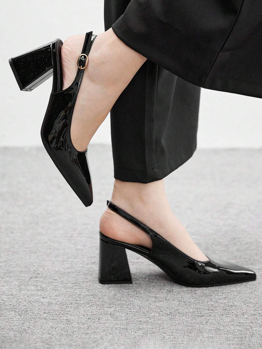 CUCCOO BIZCHIC Fashion Black Patent Leather Slingback Pointed Toe Block Heel Pumps, Classic Minimalist Style For Commuting, Dating, Party, Holiday, Wedding For Christmas Spring Shoes
