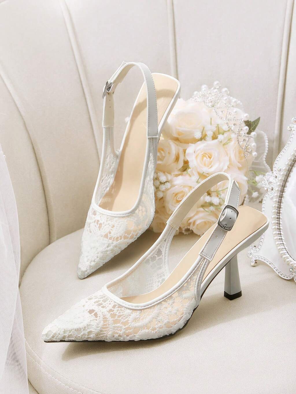 CUCCOO HITCHD Pointed Toe Lace Mesh White Wedding Shoes, Elegant Breathable Women High Heel Slingback Pumps For Christmas Elegant Shoes Wedding Shoes Summer Shoes Bride Shoes