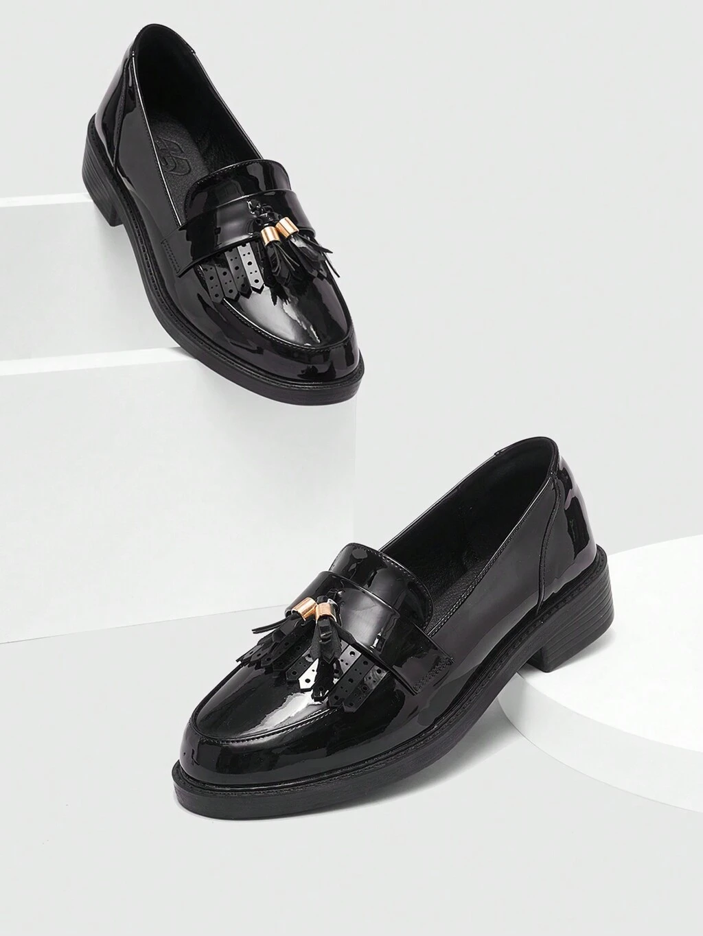 CUCCOO BIZCHIC Women's Fashion Black Patent Leather Tassel Flat Loafers For Christmas Spring Shoes