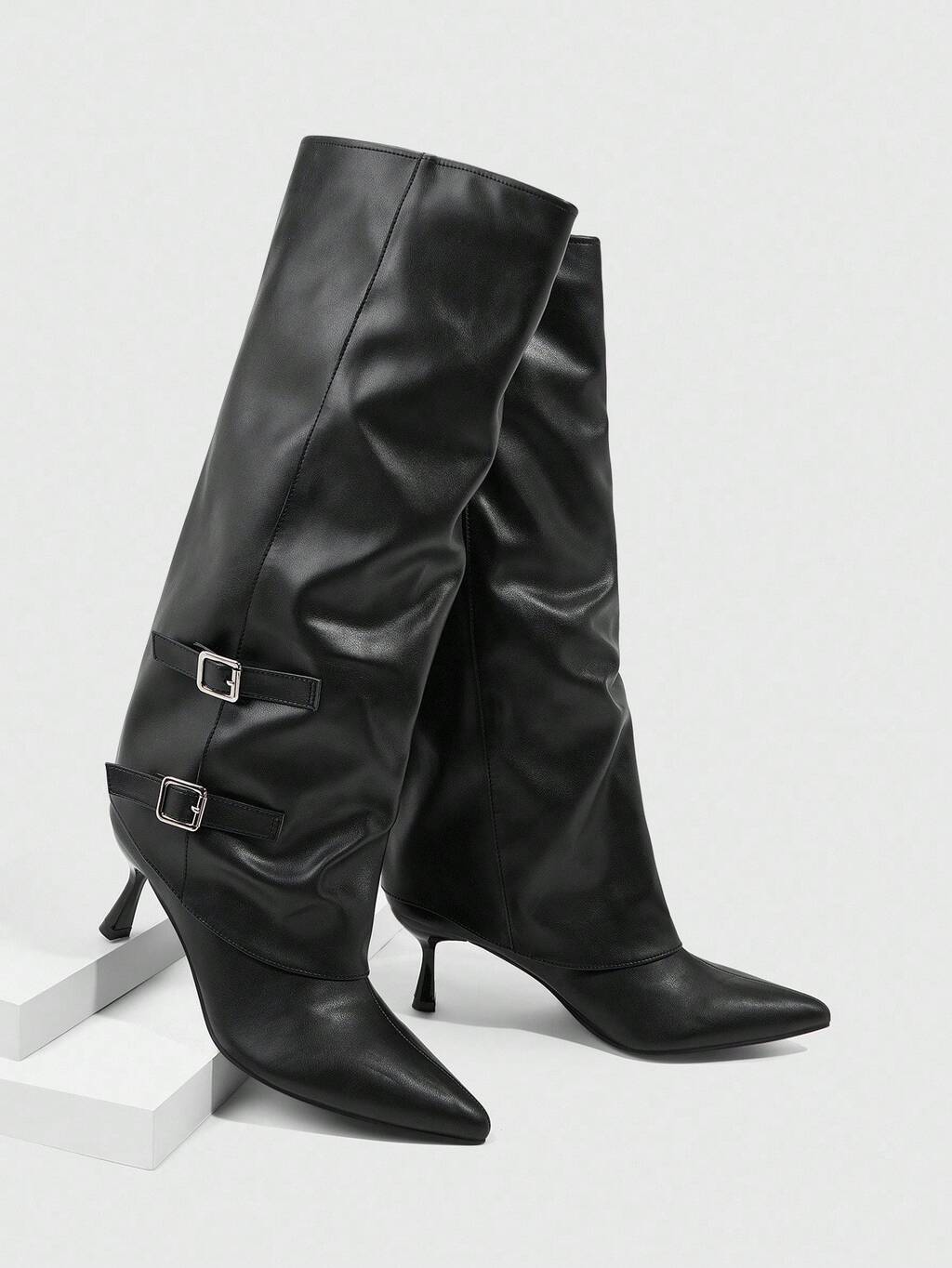 CUCCOO GRLICON Women's Pointed Toe Chunky Heel Knee-High Boots With Side Zipper And Buckle Decor, Y2K Fashion , Suitable For Halloween, Christmas, Shark Boots, Black, Autumn