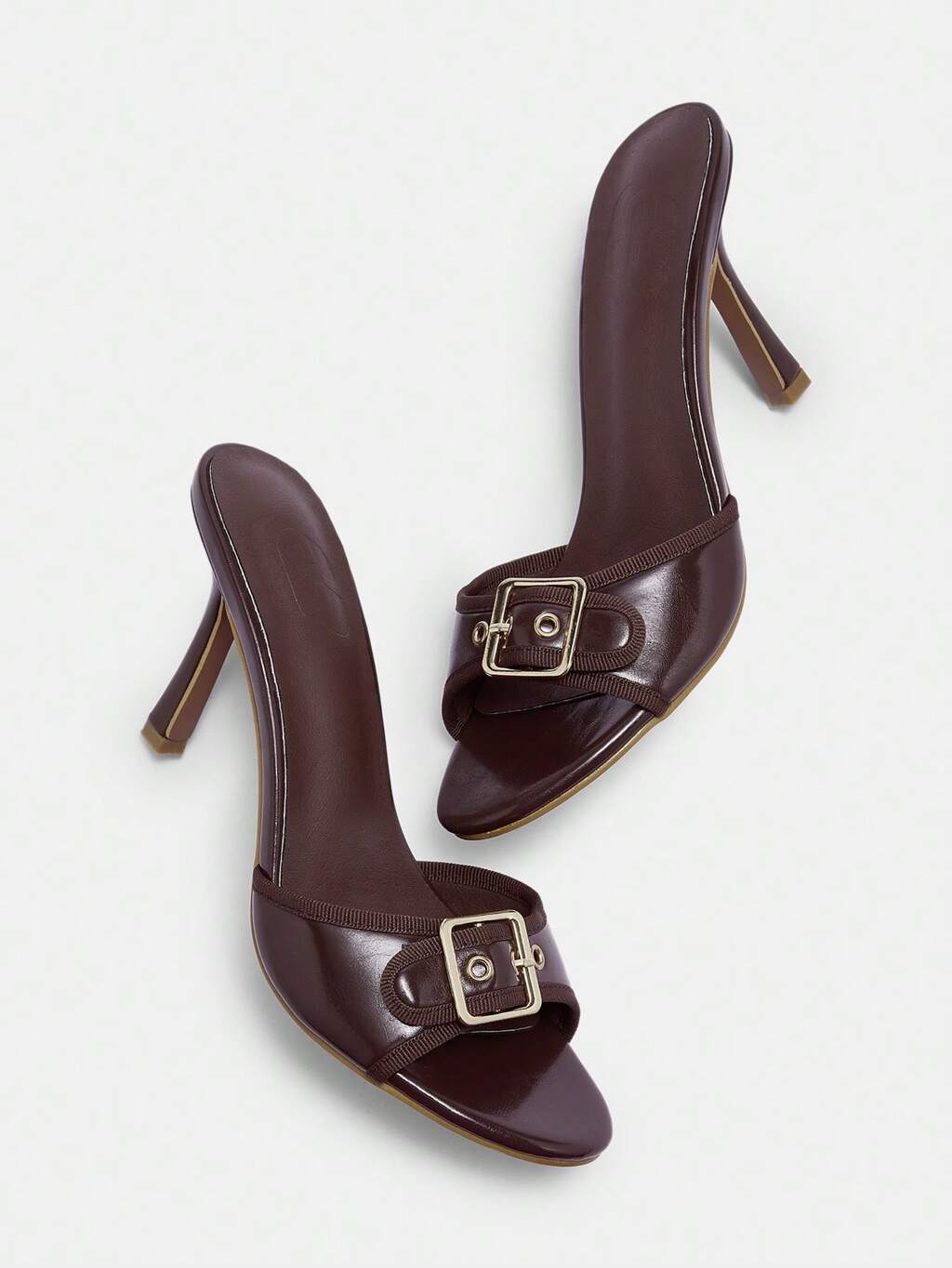 CUCCOO BIZCHIC Brown PU Leather Mixed Gold Buckle Decor 3.5" High Heel Round Toe Retro Mule Sandals For Christmas Spring Shoes
