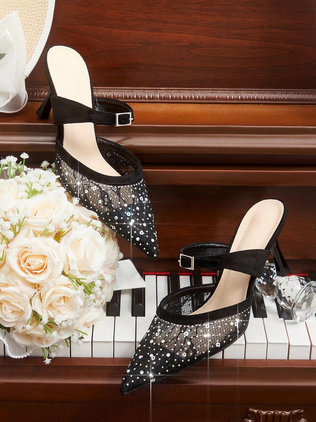 CUCCOO HITCHD Women's Pointed Toe Rhinestone Embellished Elegant High Heel Mules Valentine's Day