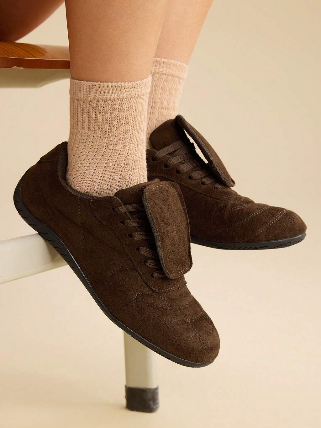 CUCCOO EASI Women Shoes Lace-Up Splicing Design Round Toe Flat Bottom Casual Sneakers Casual Simple PU Leather Breathable Fabric Khaki Casual Sneakers Daily Outdoor Sports Leisure