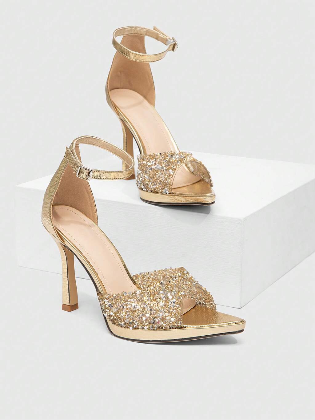 CUCCOO SZL Women's New Fashion Sexy Sandals With Rhinestone Embellished Strap, Champagne Color, Elegant Waterproof Platform High Heel Pointed-Toe Party/Wedding Dress Shoes For Christmas Spring Shoes Prom Heels Summer Shoes