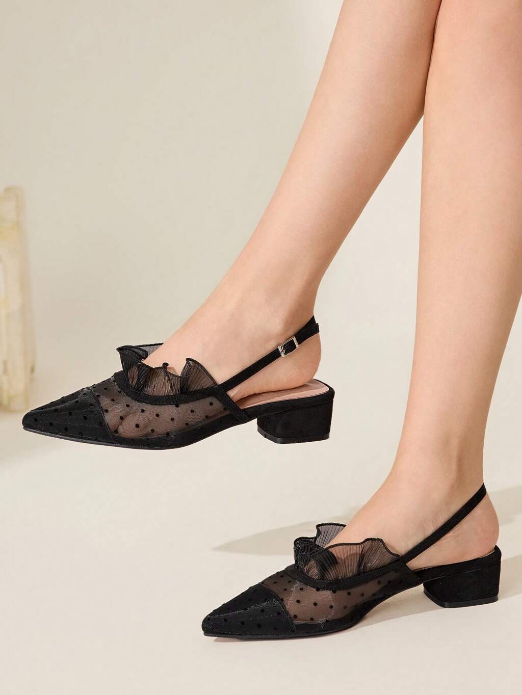 CUCCOO HITCHD Women's Elegant Pointy Toe Slingback High Heels With Beaded Mesh, Romantic Lace Design, Black Color, Suitable For Weddings, Parties, Formal Occasions Valentine's Day