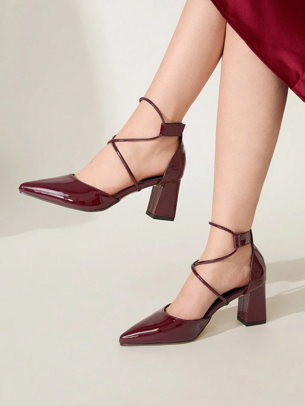 CUCCOO CHICEST Women's Fashion Wine Red Criss-Cross Strap Pointed Toe Thick High Heel Slip-On Shoes, Convenient For Commuting, Dating, Party, Festival, Holiday, Wedding Summer Shoes Summer Break Easter Prom Heels For Christmas Elegant Shoes Wedding Shoes Summer Shoes Bride Shoes
