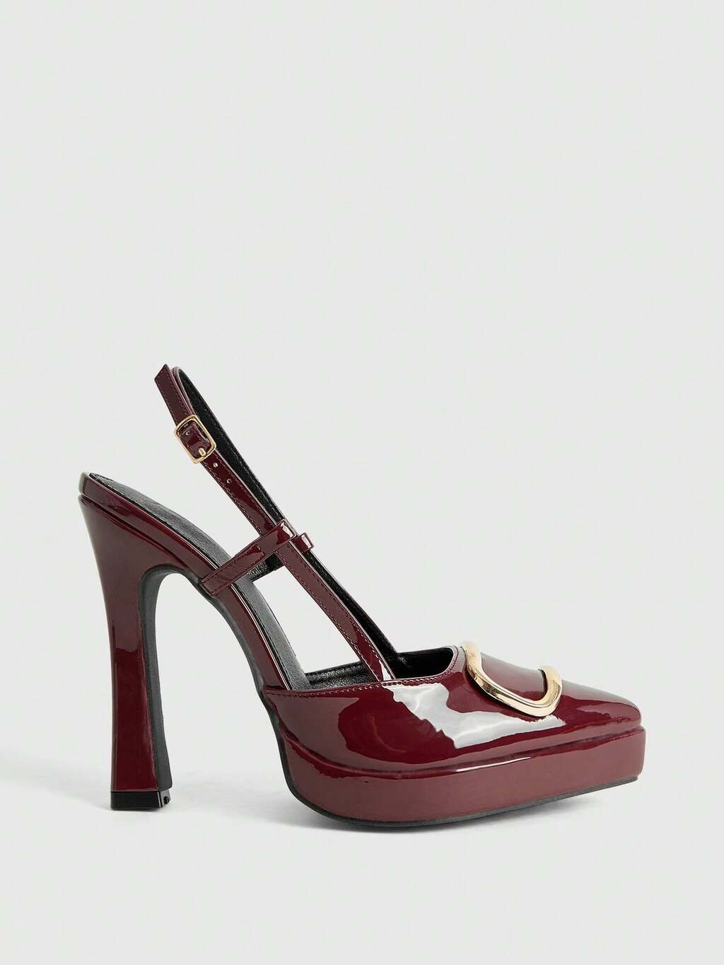 CUCCOO LuxiPop Women's Pointed Toe High Heel Waterproof Platform Shoes, Gold Buckle Decor, PU Leather, Fashionable Minimalist Design, Comfortable For Daily, Party, And Banquet Wear, Open Heel Slip-On Valentine's Day