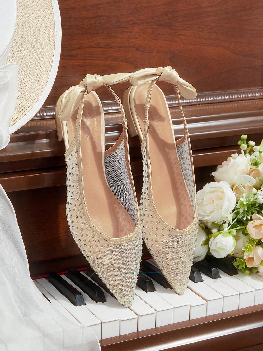 CUCCOO HITCHD Women Shoes Summer And Summer New Fashion French Mesh Rhinestone Pointed Flat Sole Shoes, Bow With Slip-On, Comfortable, Elegant And Versatile, Not Tired, Golden Hot Diamonds Are Very Beautiful Summer Shoes Wedding Shoes Bride Shoes