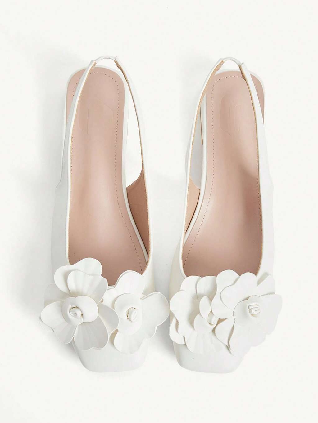 CUCCOO CHICEST Women Shoes Fashionable White Three-Dimensional Flower Back Strap Low Heel Square Toe Commuting Versatile Elegant Party Vacation Women Flat Shoes Slingback Shoes