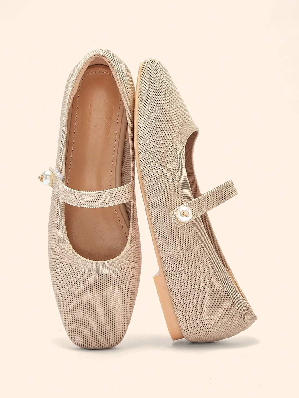 CUCCOO BASICS Women Shoes Round Toe Flat Bottom Apricot Knitted With Pearl Comfortable And Breathable Daily Commuter Versatile Flat Bottom Mary Jane Women's Shoes Women's Flat Bottom Shoes