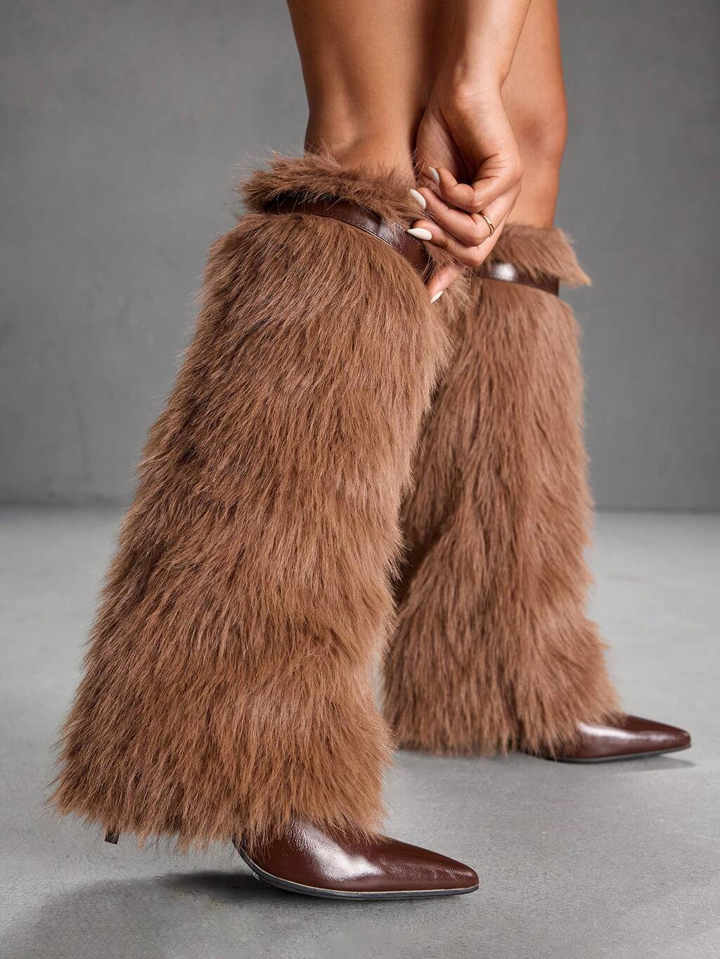 CUCCOO SZL Women's Black Pointed Toe Stiletto Heel Furry Warm Knee-High Boots, European And American Style For Autumn/Winter