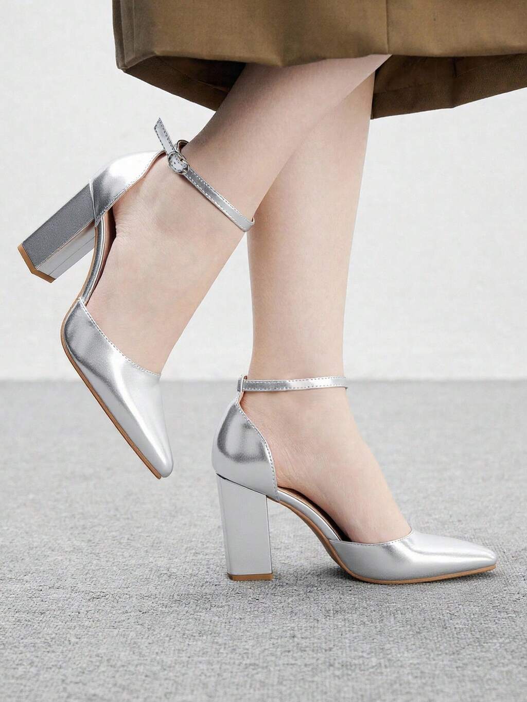 CUCCOO BIZCHIC Women's Fashion Silver Material Ankle Strap Pointed Toe Chunky Heel Pumps, Comfortable For Commuting, Dating, Gathering, Party And Other Occasions For Christmas Spring Shoes