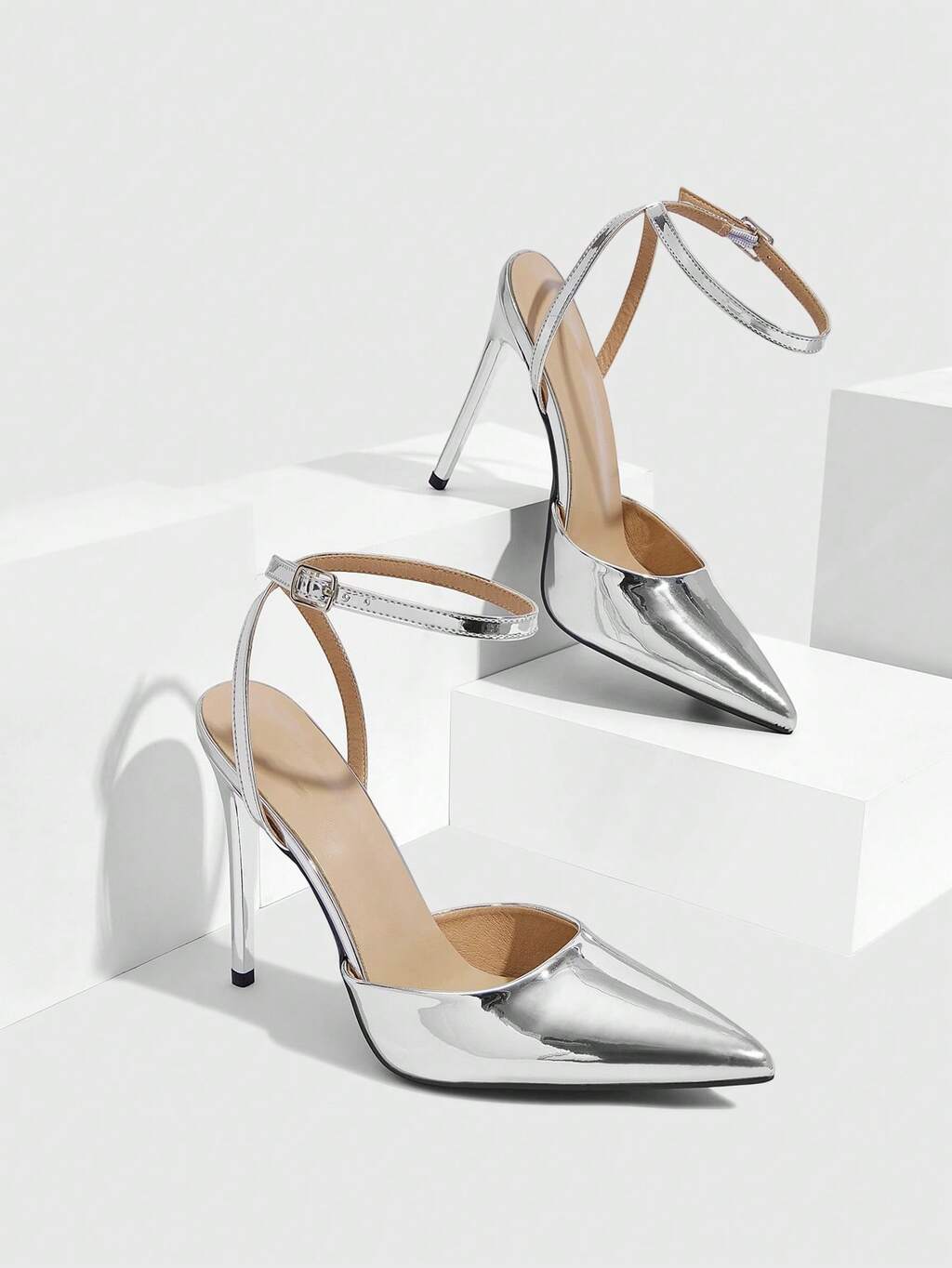 CUCCOO SZL Women Shoes Pointed Thin High Heel Silver Glossy Ankle Strap Women's Shoes Simple Temperament Fashion Sexy Party Banquet Nightclub Women's High Heel Shoes Women's Shoes
