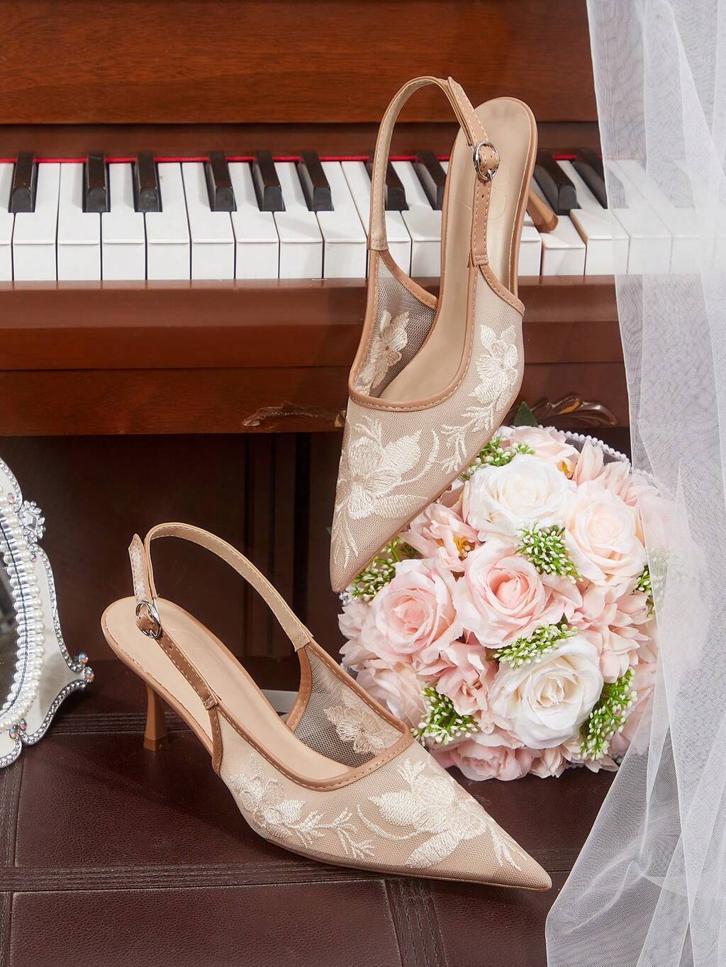 CUCCOO CHICEST Women's Fashion Pointed Classic PU Embroidered Mesh Yarn With Sexy Evening Wear Party Style Simple Slingback Stiletto High Heels Shoes