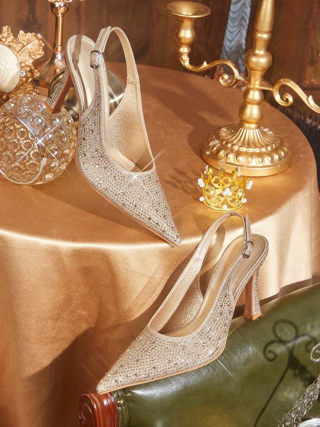 CUCCOO TILAWA Women Shoes Pointed Slender Heel Gold Rhinestone Sexy Fashion Gorgeous Slingback Shoes With Skirts Banquet Party Night Club Women's High Heel Shoes Women's Shoes