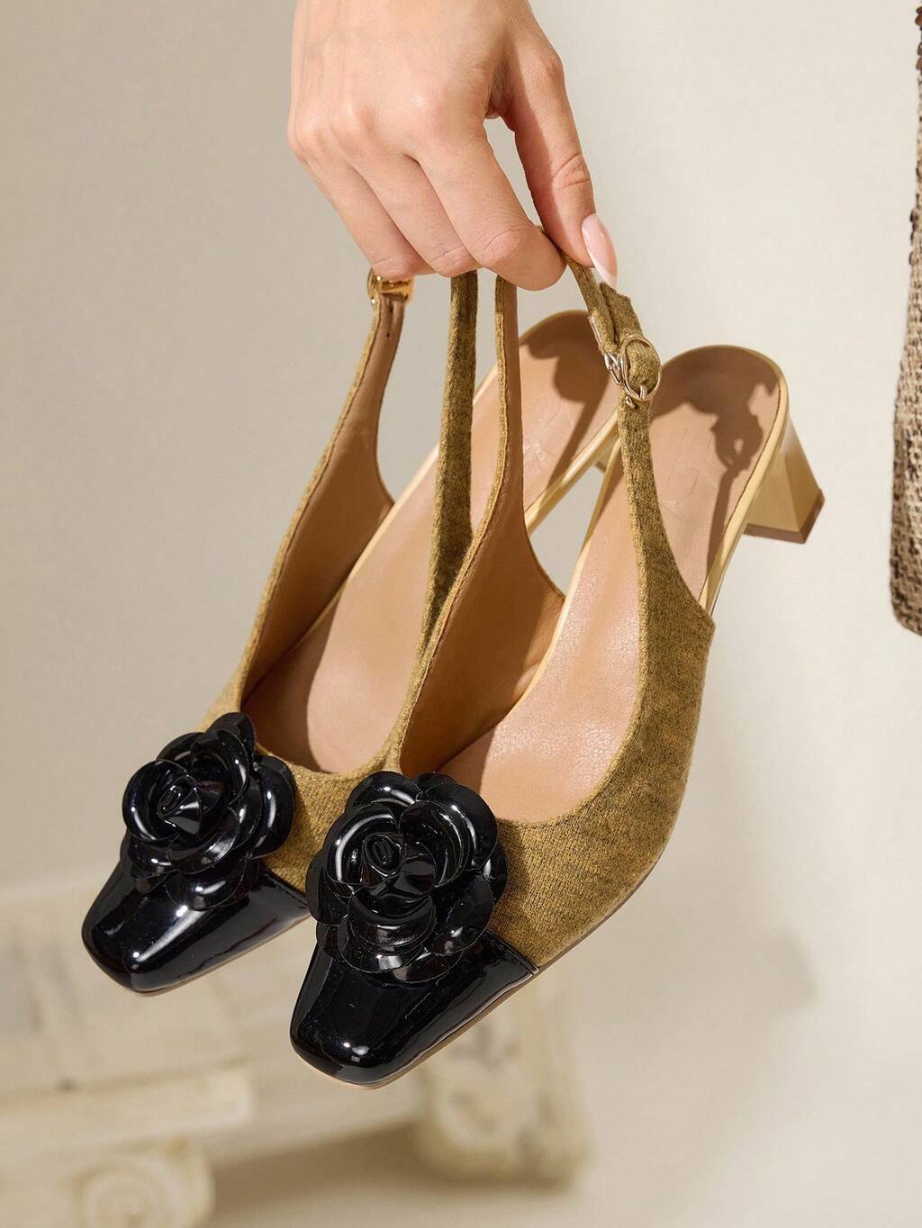 CUCCOO BIZCHIC Women Shoes Square Heel Metal Buckle Black Mirror Fashion Simple Women's High Heel Shoes Back Belt Shoes Vacation Wear Versatile Commuter Wear Old Money Style Wear Spring Shoes