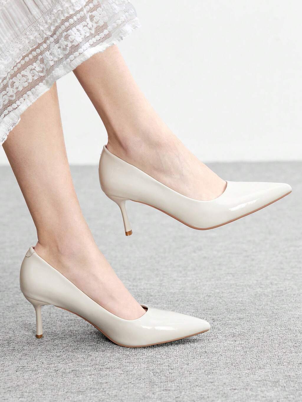 CUCCOO BIZCHIC Women's Fashion White Patent PU Pointed Toe Slip-On Shoes, Simple Design For Evening, Commute, Party, White Office Work Pumps With Small Heels For Christmas Spring Shoes