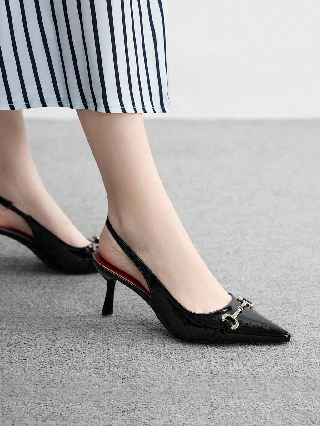 CUCCOO SZL Women's Pointed Toe Black Patent Leather Thin Heel Rhinestone Chain Strap Backless Sexy Fashion Date Night High Heels Spring Shoes