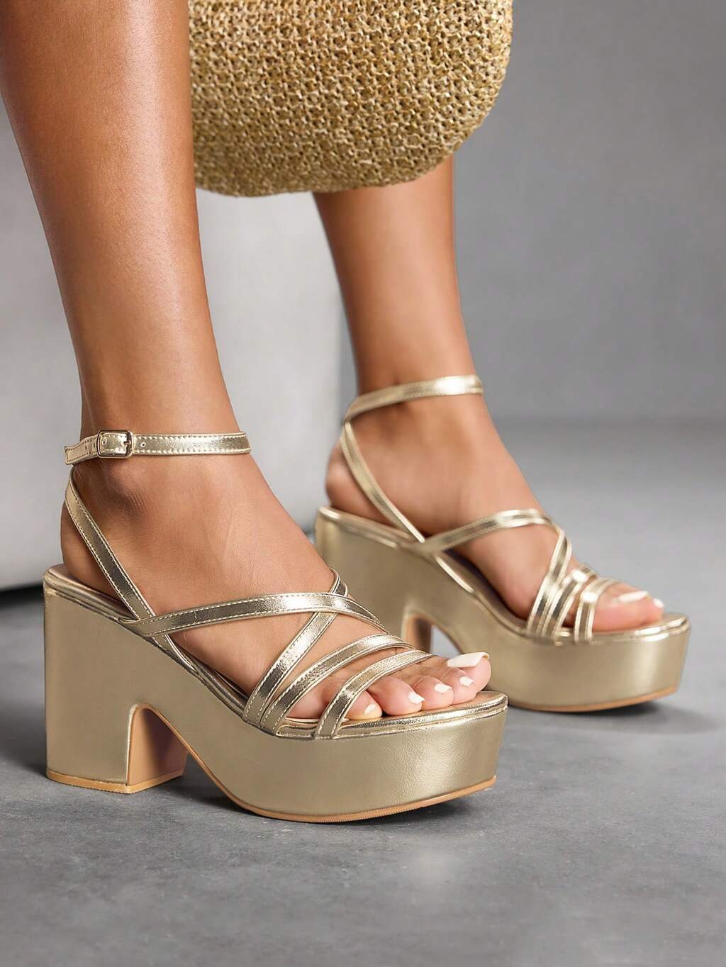 CUCCOO SZL Fashion Gold Strap Thick Bottom Wedge Gold Color High Heels Sandals For Christmas Spring Shoes Summer Shoes