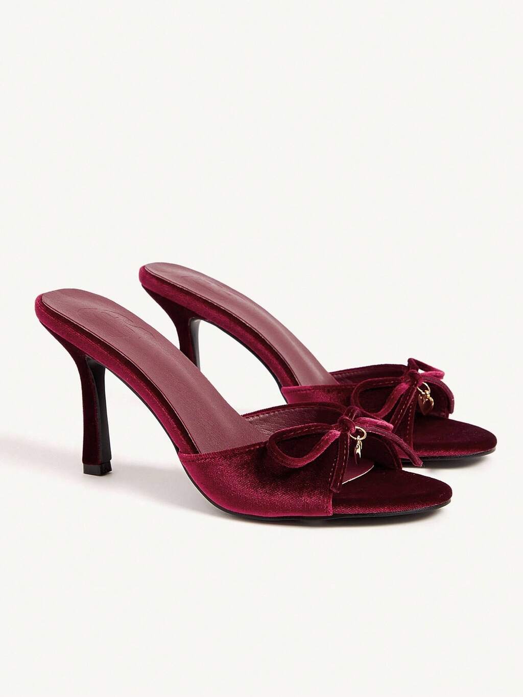 CUCCOO CHICEST Women's Velvet Bow & Golden Heart Decor Fashion Elegant Romantic Sexy Round Toe Mule High Heel Sandals In Wine Red For Christmas Elegant Shoes Wedding Shoes Summer Shoes Bride Shoes