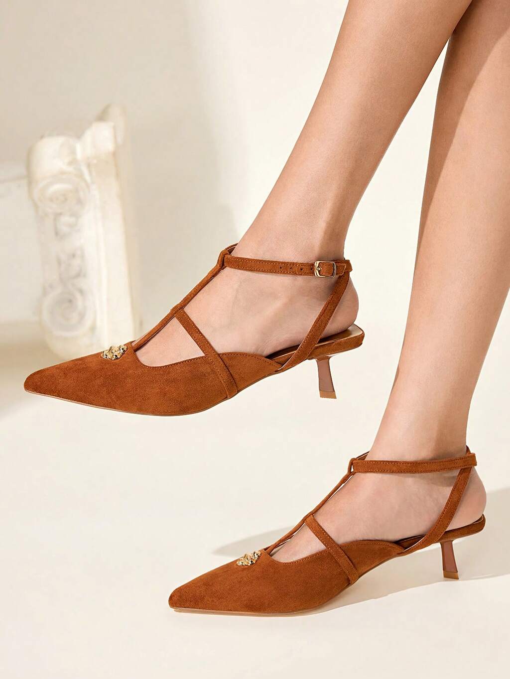 CUCCOO BIZCHIC Women's Fashion Coffee Brown T-Strap Pointed Toe Low Heel Ankle Strap Shoes, Commuting, Dating, Party Wear Spring Shoes Spring Break Easter For Christmas Spring Shoes