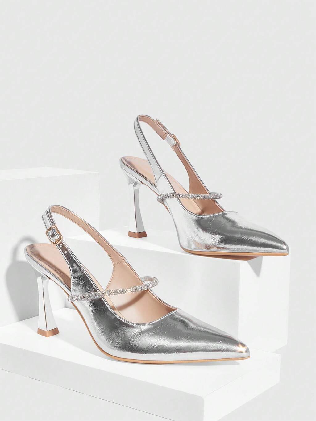 CUCCOO SZL Women's Silver Elegant Pointed Toe High Heel Pumps, Rhinestone Decor Pyramid Heel Sexy High Heels, Alluring Party Ankle Strap Stilettos, Suitable For Office, Outdoor, Wedding, Banquet, Party, Spring, Easter Spring Shoes