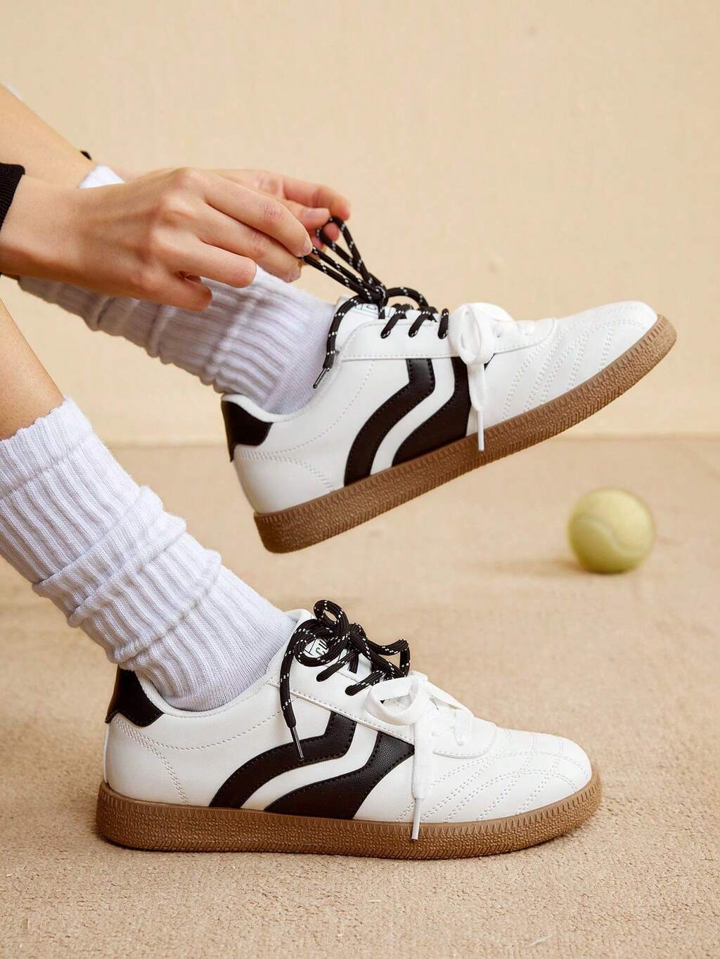 CUCCOO EASI Women's Lace-Up Splicing Breathable Design Round Toe Thick Flat Bottom Casual Sports Shoes Simple And Comfortable Daily Outdoor Casual PU Leather Black And White Casual Sports Shoes
