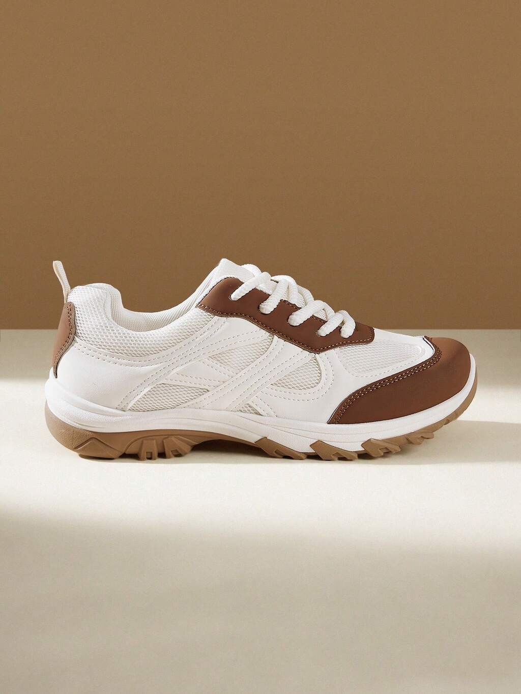 CUCCOO EASI Contrast Color Solid Preppy Casual Gym Sneakers For Women, Lace-Up Brown Patchwork Flat Retro Casual Outdoor Sports Running Shoes