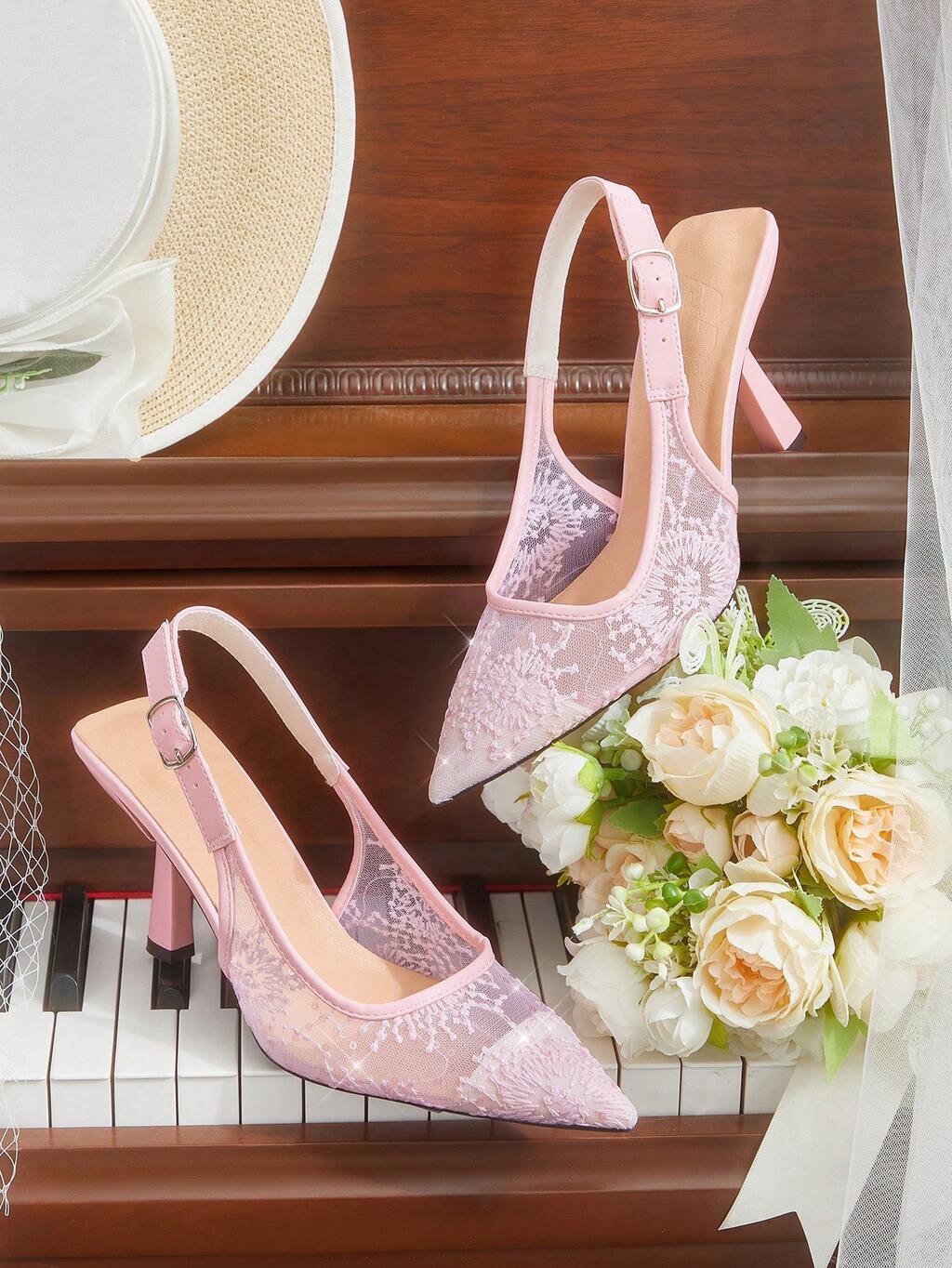 CUCCOO CHICEST New Summer Women's Pointy Toe Floral Embroidered Lace Mid Heel Elegant Romantic Mesh Lace Slip-On High Heels, Ideal For Formal Dress, Wedding, Party, Afternoon Tea, Date Night For Christmas Elegant Shoes Wedding Shoes Summer Shoes Bride Shoes