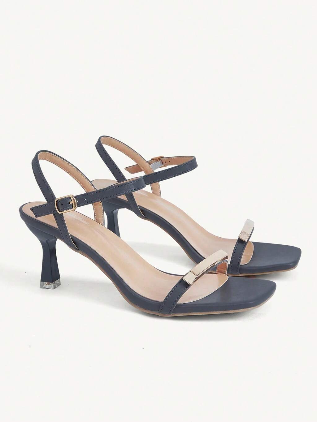 CUCCOO CHICEST Women's Summer New Metal Strap Square Open-Toed Kitten Heel High Heels Commuter Style Dark Blue High Heels Sandals Summer Shoes