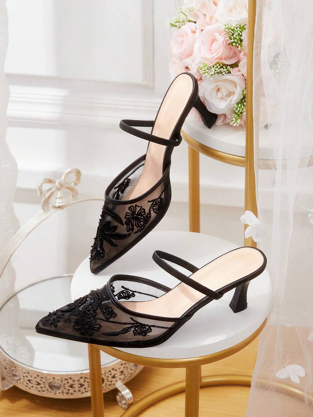 CUCCOO HITCHD Women's Fashion Casual Pointed Toe Mule Shoes, Mesh Patchwork High Heel Sandals, Lightweight High Heel Slippers For Wedding, Party, Banquet, Height Increasing Elegant Shoes Wedding Shoes