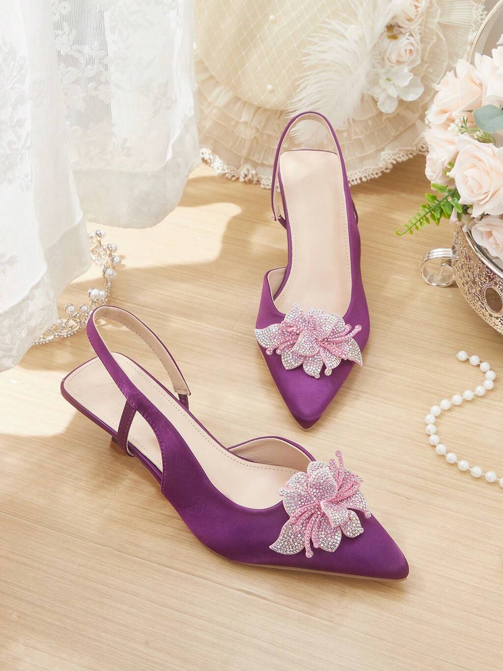 CUCCOO HITCHD Women's High Heel Pumps, Elegant & Graceful Pointed Toe, Pink Crystal Floral, Purple Satin, Bridal, Bridesmaid, Wedding Guest Party Open Toe Shoes