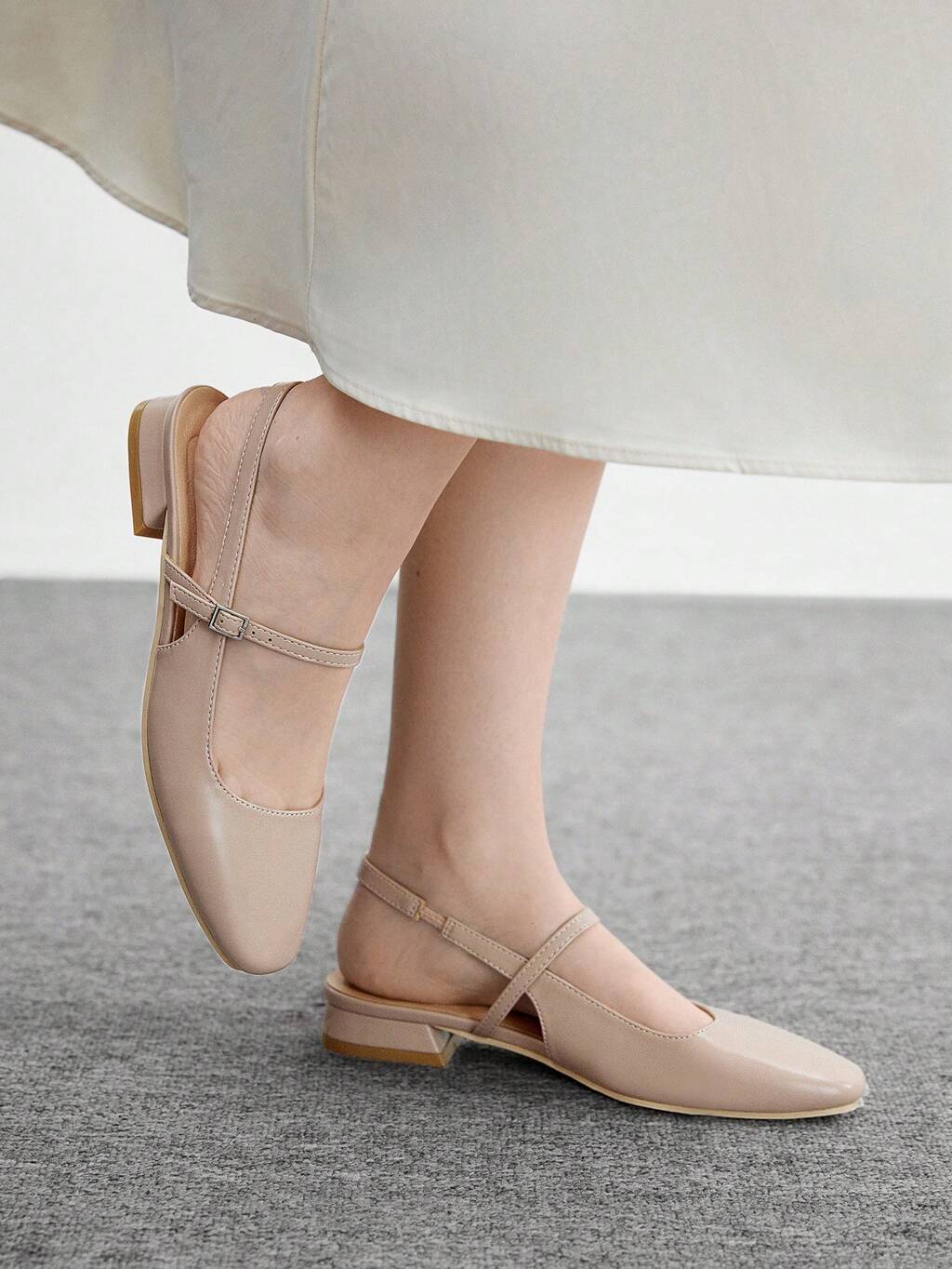 CUCCOO BIZCHIC Women's Classic Slingback Flats With Ankle Strap, Beige PU Leather Low Block Heel Shoes For Work, Date, Party, Holiday, Everyday For Christmas Spring Shoes