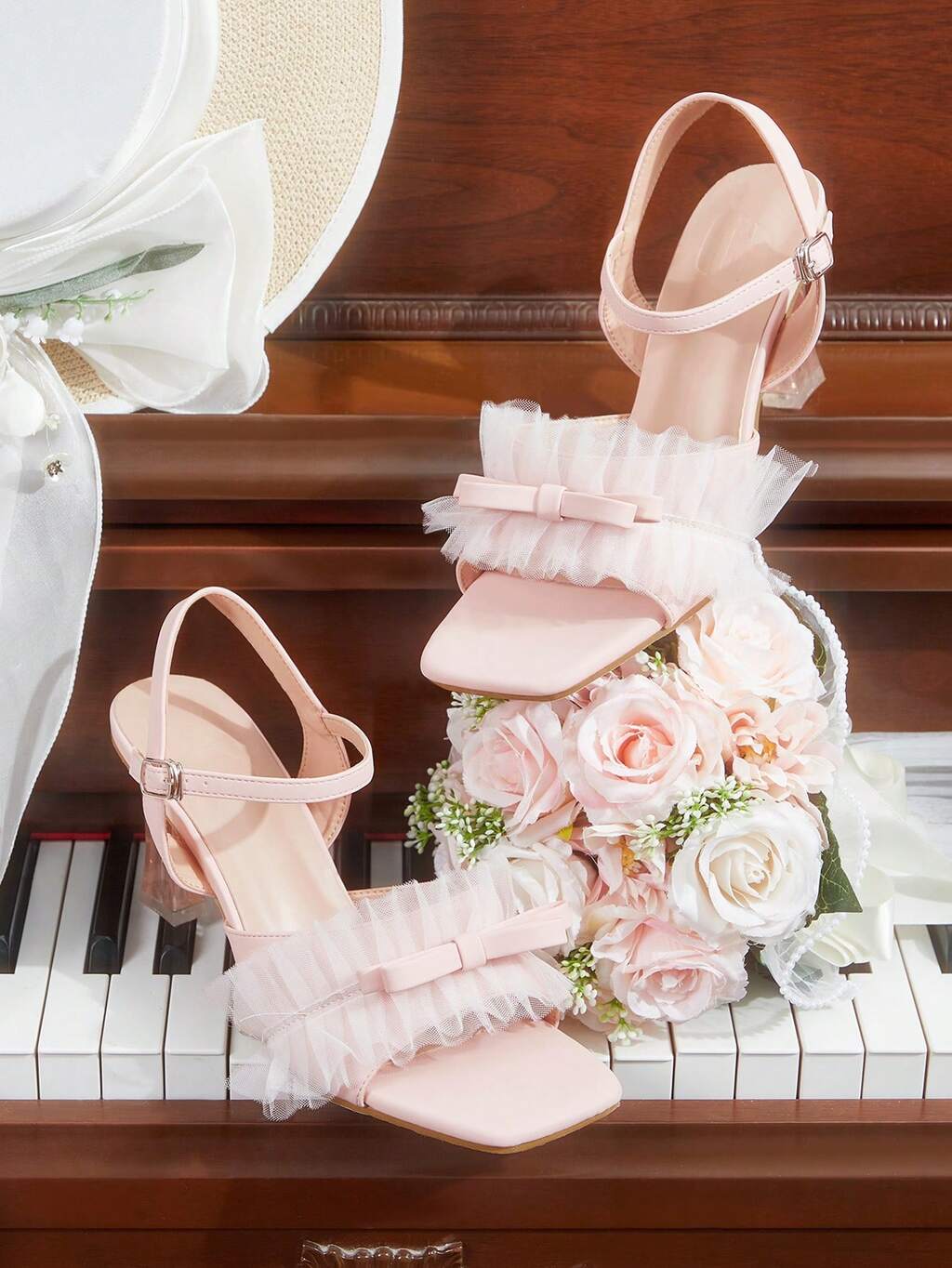 CUCCOO HITCHD Women's Fashionable Elegant Bow Tie Mesh Decor Heeled Sandals Summer Shoes Wedding Shoes Bride Shoes