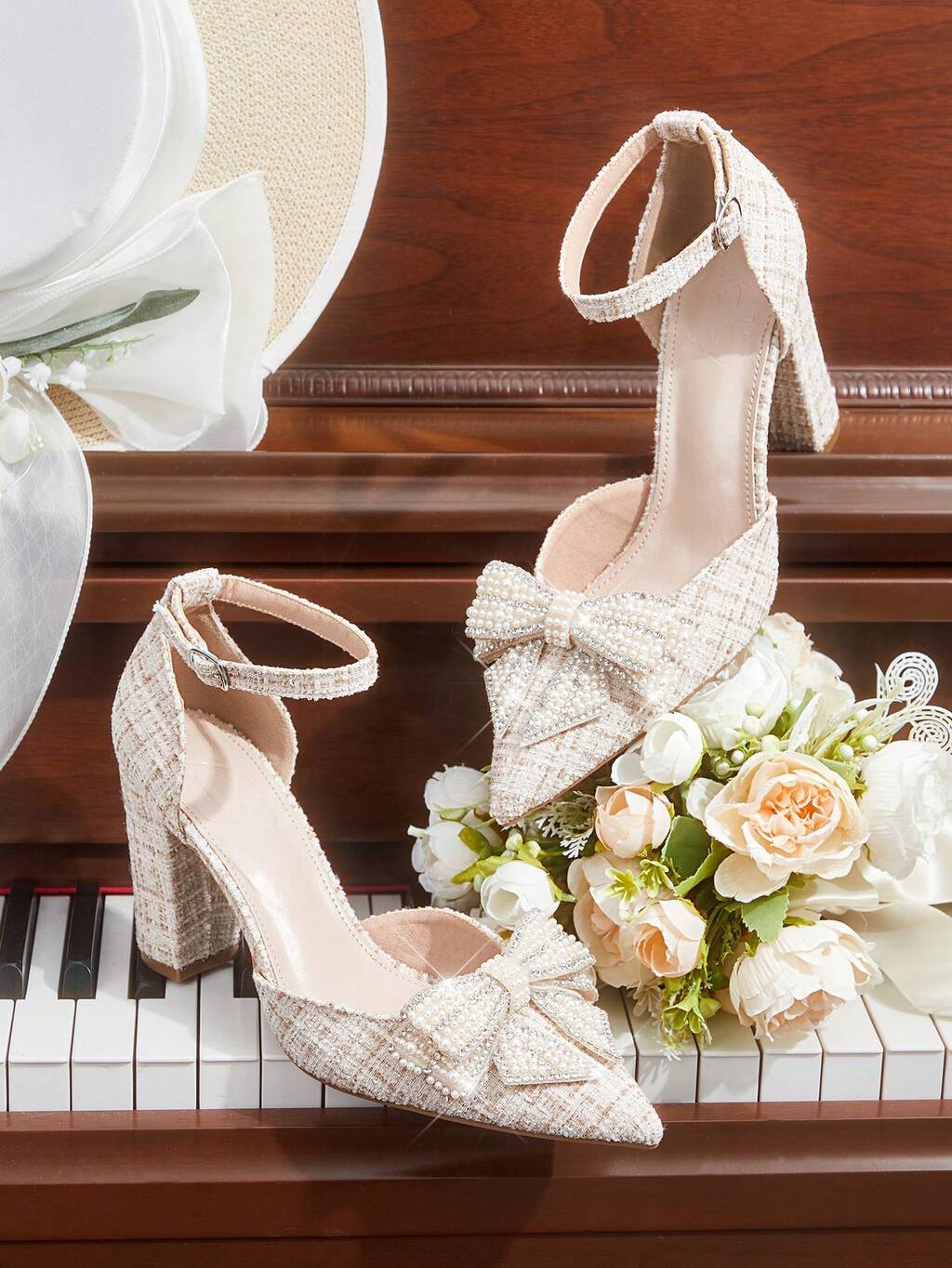 CUCCOO HITCHD Women Shoes Summer And Summer Pearl Bow Pointed Thick Heel 9.5cm Women's High Heel Shoes Solid Color Dating Wedding Versatile Not Tired Feet Elegant And Skinny Fashion New Summer Shoes Wedding Shoes Bride Shoes
