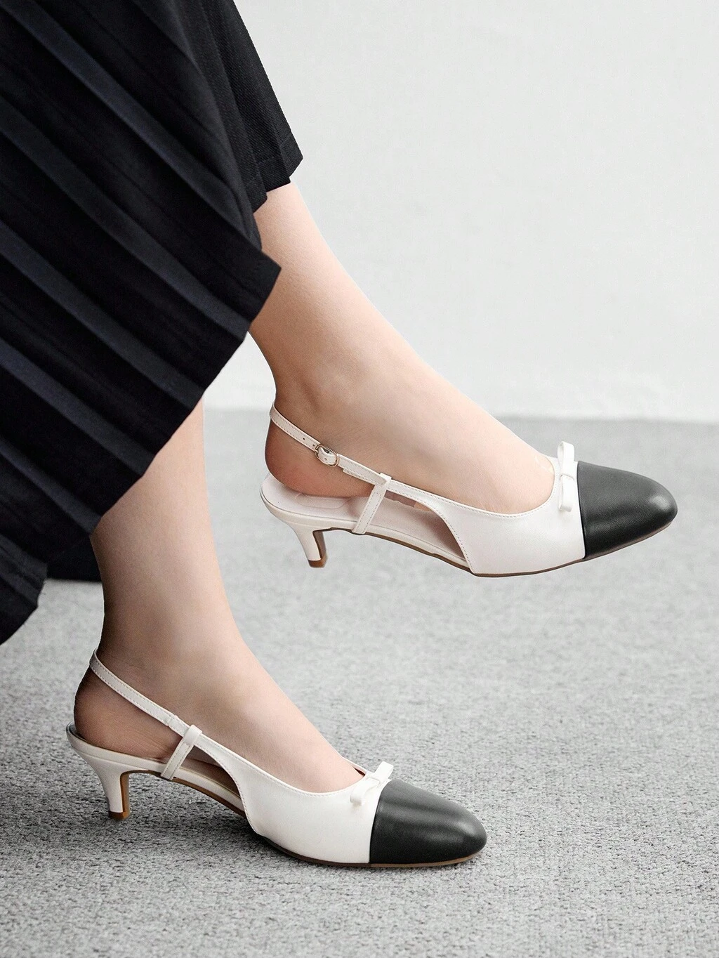 CUCCOO BIZCHIC Tacones altos elegantes de uso diario con tacón fino, de color negro y blanco, con parche de lazo y sin respaldo, de peso ligero