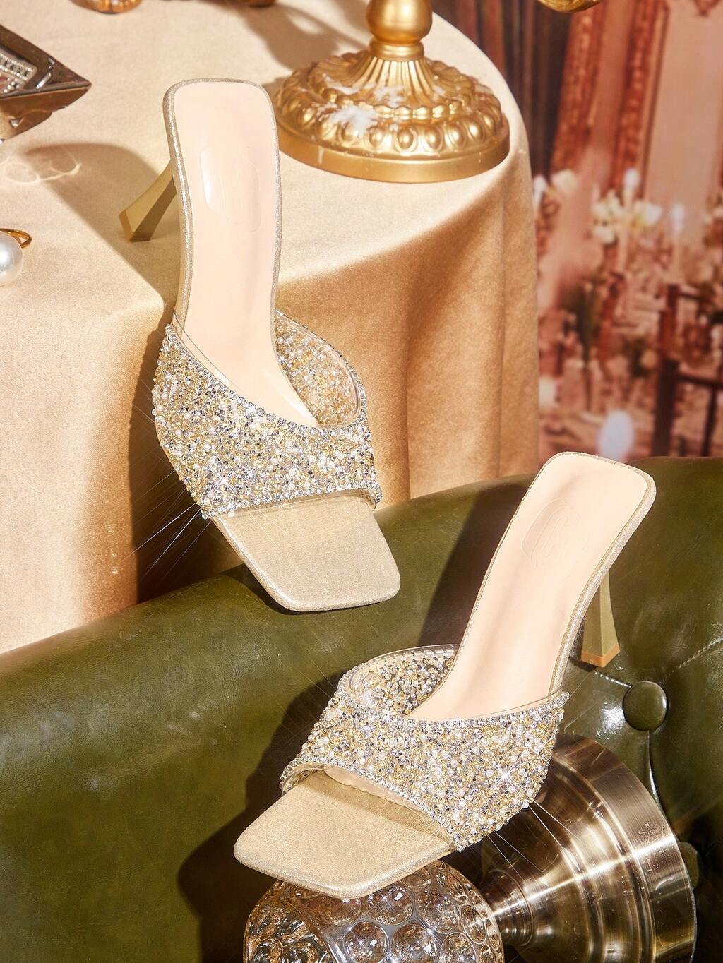 CUCCOO TILAWA Sandalias de tacón alto para mujer con puntera cuadrada, tacón delgado, película transparente dorada, perlas y rhinestones, diseño sexy, elegante y glamoroso, versátiles para usar con faldas en eventos diarios y fiestas