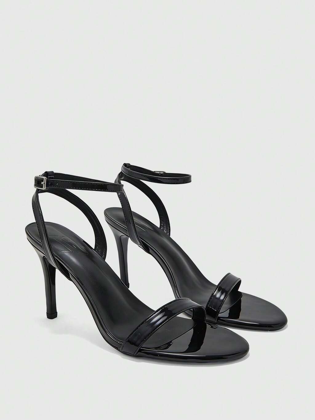CUCCOO SZL Tacones altos de fiesta sexy con puntera puntiaguda, tira de tobillo y decoración de rhinestones en piel de patente negra
