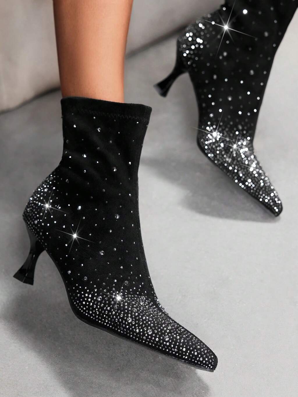 CUCCOO SZL Botas de tacón de gatito con punta puntiaguda, sexy, con rhinestones negros, para vestido de fiesta, boda y noche formal. Zapatos sencillos de primavera para Navidad