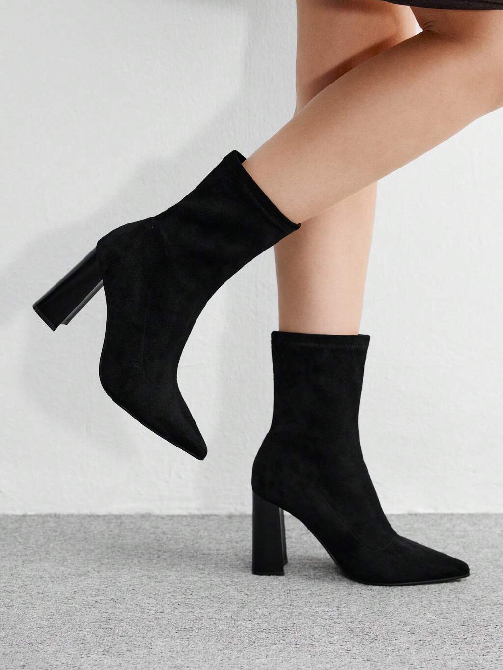 CUCCOO BIZCHIC Botas de tobillo de ante negro con tacón alto y grueso de punta afilada para mujer, versátiles para uso diario, ir al trabajo, compras