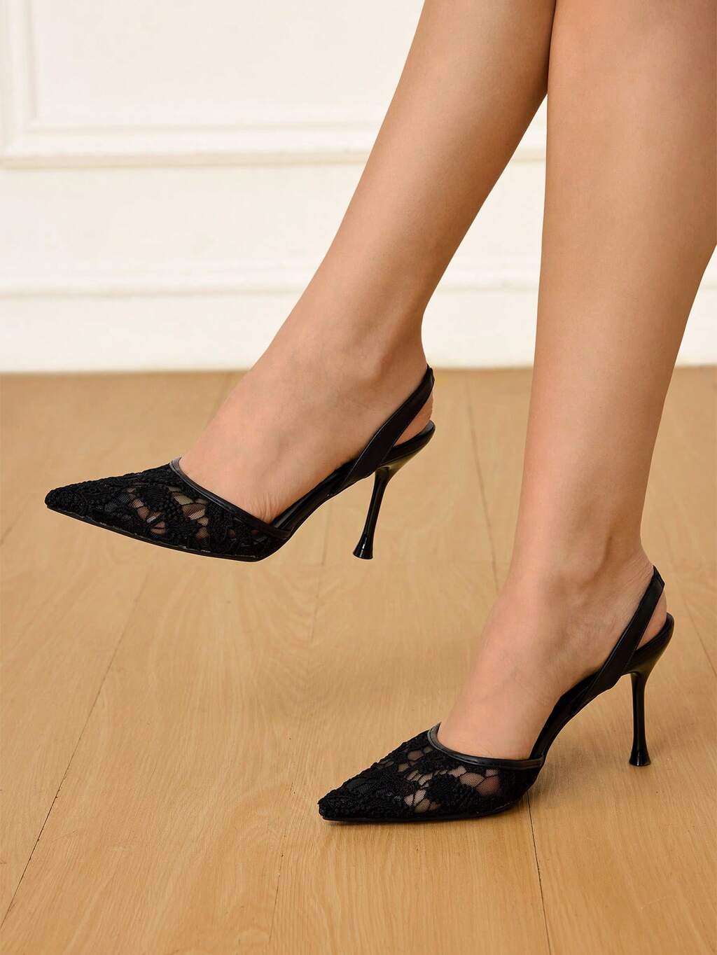 CUCCOO HITCHD Tacones altos de mujer con punta afilada, tacón de aguja, de encaje negro, malla transpirable, calado y sexy, elegantes tacones altos con correa de tobillo, versátiles para uso diario, fiestas y reuniones