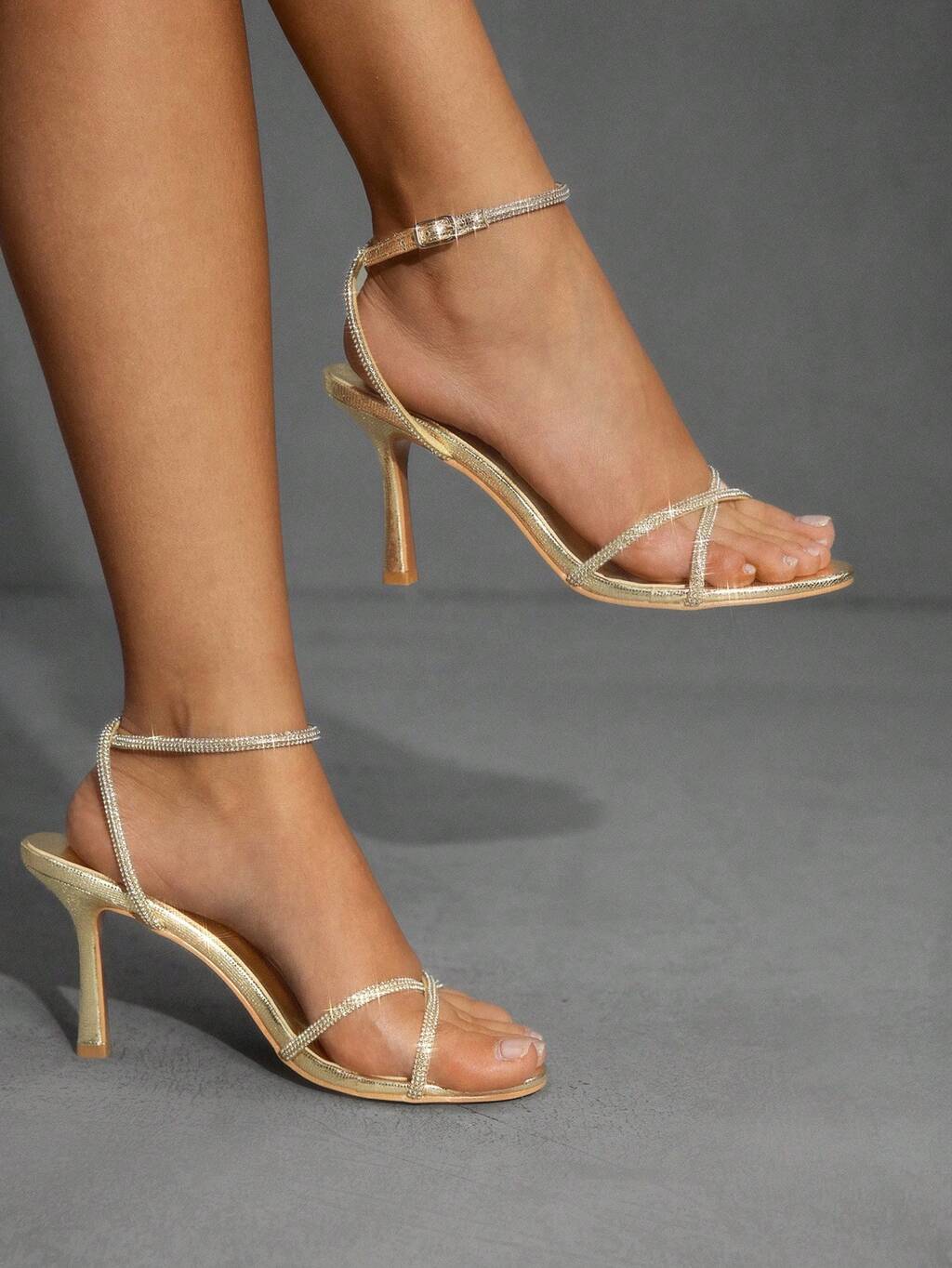 CUCCOO SZL Sandalias de tacón alto delgado con puntera redonda, estilo de discoteca metálico sexy y con decoración de strass, correa de PU y metal dorado para mujer