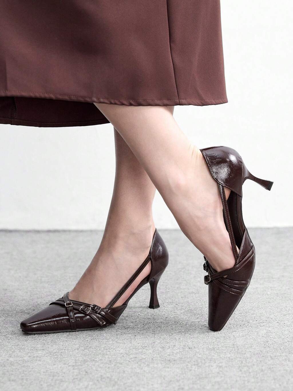CUCCOO BIZCHIC Bombas de tacón alto fino con hebilla decorativa, de cuero PU, de estilo retro y minimalista, cómodas para uso diario y fiestas, con diseño hueco, para mujer