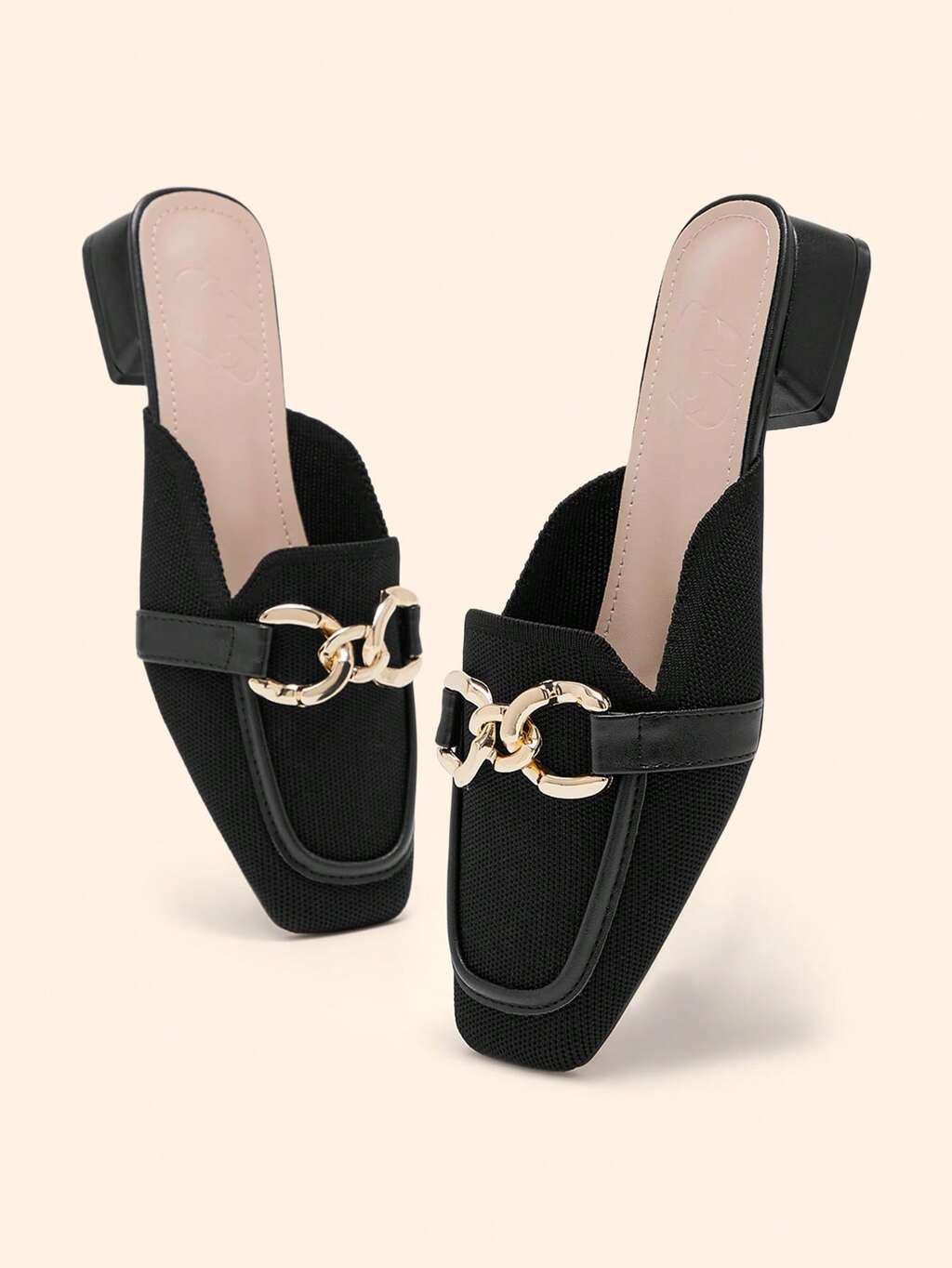 CUCCOO BASICS Mulas de mujer con tacón bajo, punta cuadrada, de moda, de punto negro con hebilla de metal, cómodas y de fácil deslizamiento, adecuadas para uso diario, ir al trabajo y citas