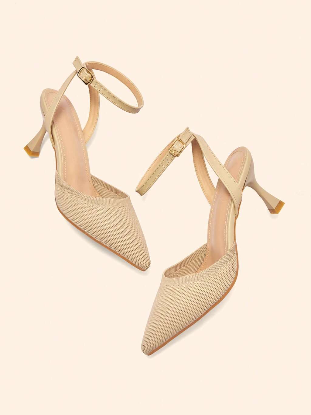 CUCCOO BASICS Tacones de mujer con punta afilada, tira de tobillo y tacón de aguja en tela de punto de color albaricoque, cómodos para ir al trabajo, la oficina, las vacaciones y el uso diario